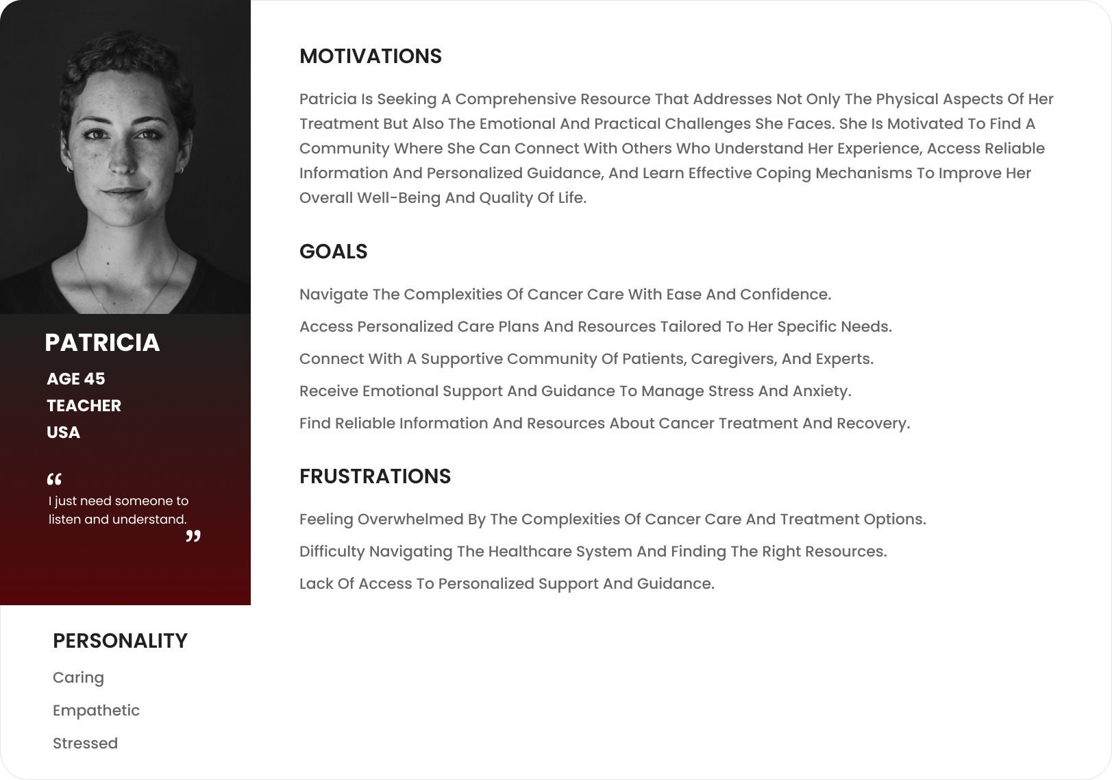 - Motivation: Seeking a supportive community and reliable information to navigate her treatment journey.