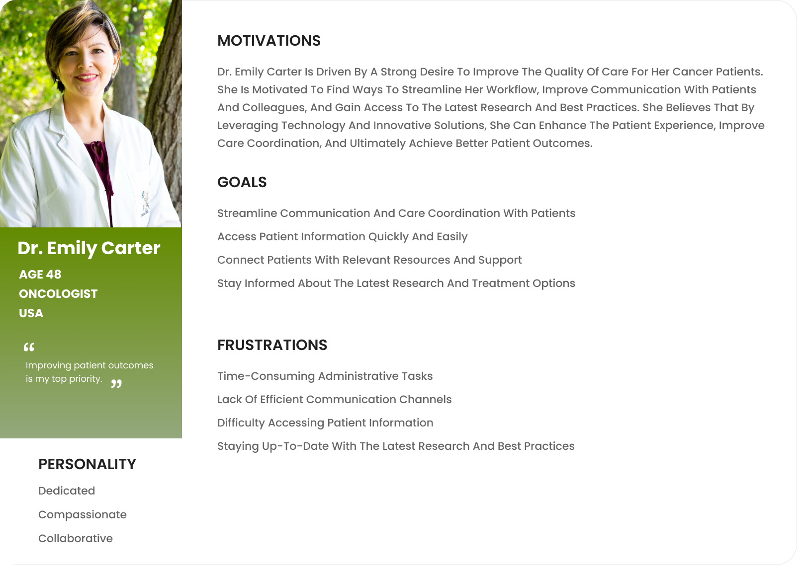 Patricia is a cancer patient seeking a supportive community, reliable information, and personalized guidance to navigate her treatment journey. Dr. Emily Carter is an oncologist driven to improve patient outcomes by streamlining workflows, enhancing communication, and providing access to the latest research and best practices.