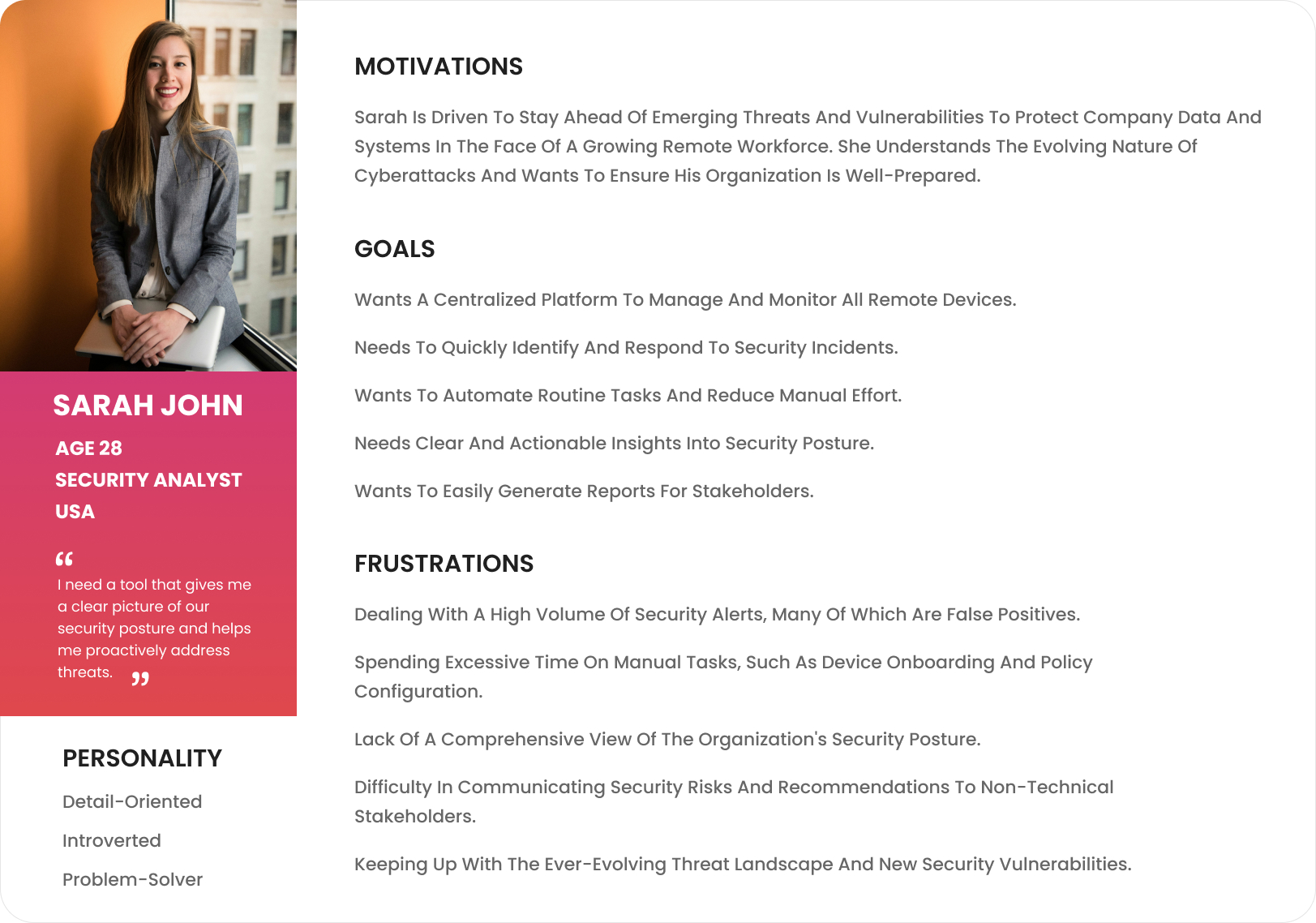 To keep users in mind, I created Sarah John. She's a 28-year-old Security Analyst working for one of Remotely's clients. Her hopes (like 'fixing security issues fast') and daily frustrations (like 'too many alerts' that lead to UX Risk) guided every design choice I made to improve their ability to manage Technical Risk.